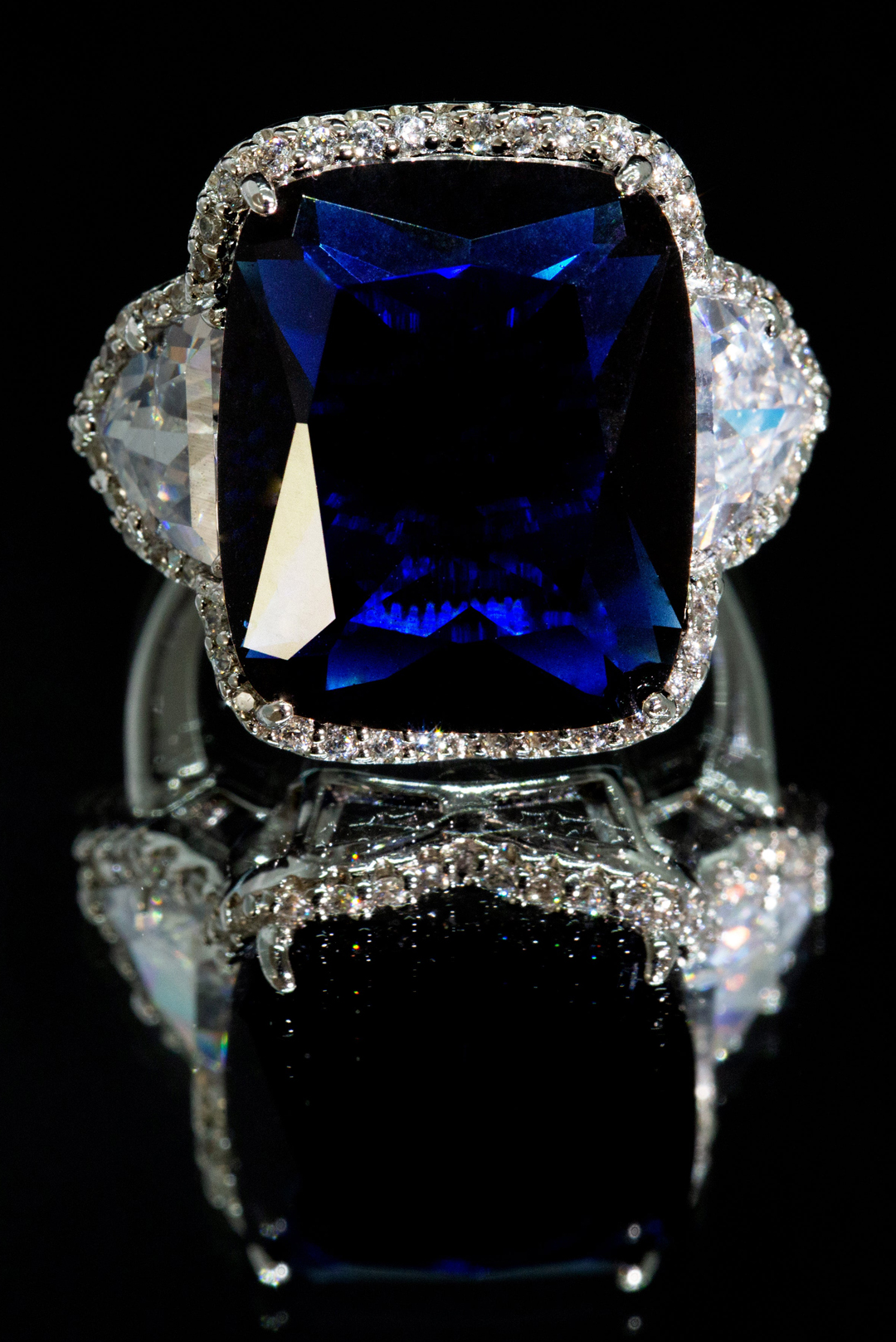 Emarald μοϊσανίτης σε βαθύ μπλέ  διακοσμημένος σε pave σχέδιο με μικρότερους μοϊσανιτες στα πλαϊνά δεμένο σε σκελετό από ασήμι 925. GM: 6,90 Καράτια Βάρος: 4.00