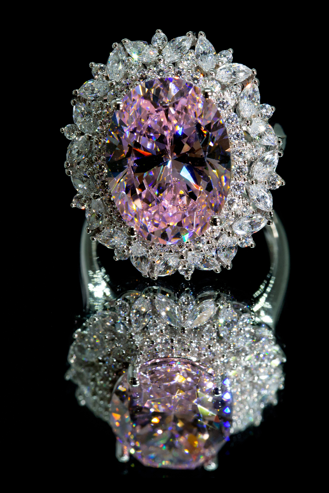 Oval μοϊσανίτης σε απάλο ροζ διακοσμημένος σε pave σχέδιο με μικρότερους μοϊσανιτες στα πλαϊνά δεμένο σε σκελετό από ασήμι 925. GM: 10,30 Καράτια Βάρος: 4.00