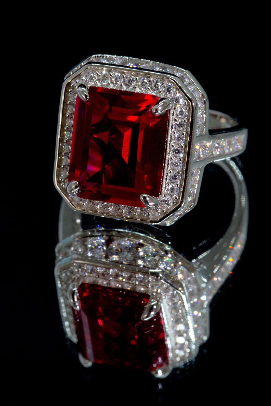 Radiant μοϊσανίτης  σε μπορντό απόχρωση διακοσμημένος σε pave σχέδιο με μικρότερους μοϊσανιτες στα πλαϊνά δεμένο σε σκελετό από ασήμι 925. GM: 7,60 Καράτια Βάρος: 3.00
