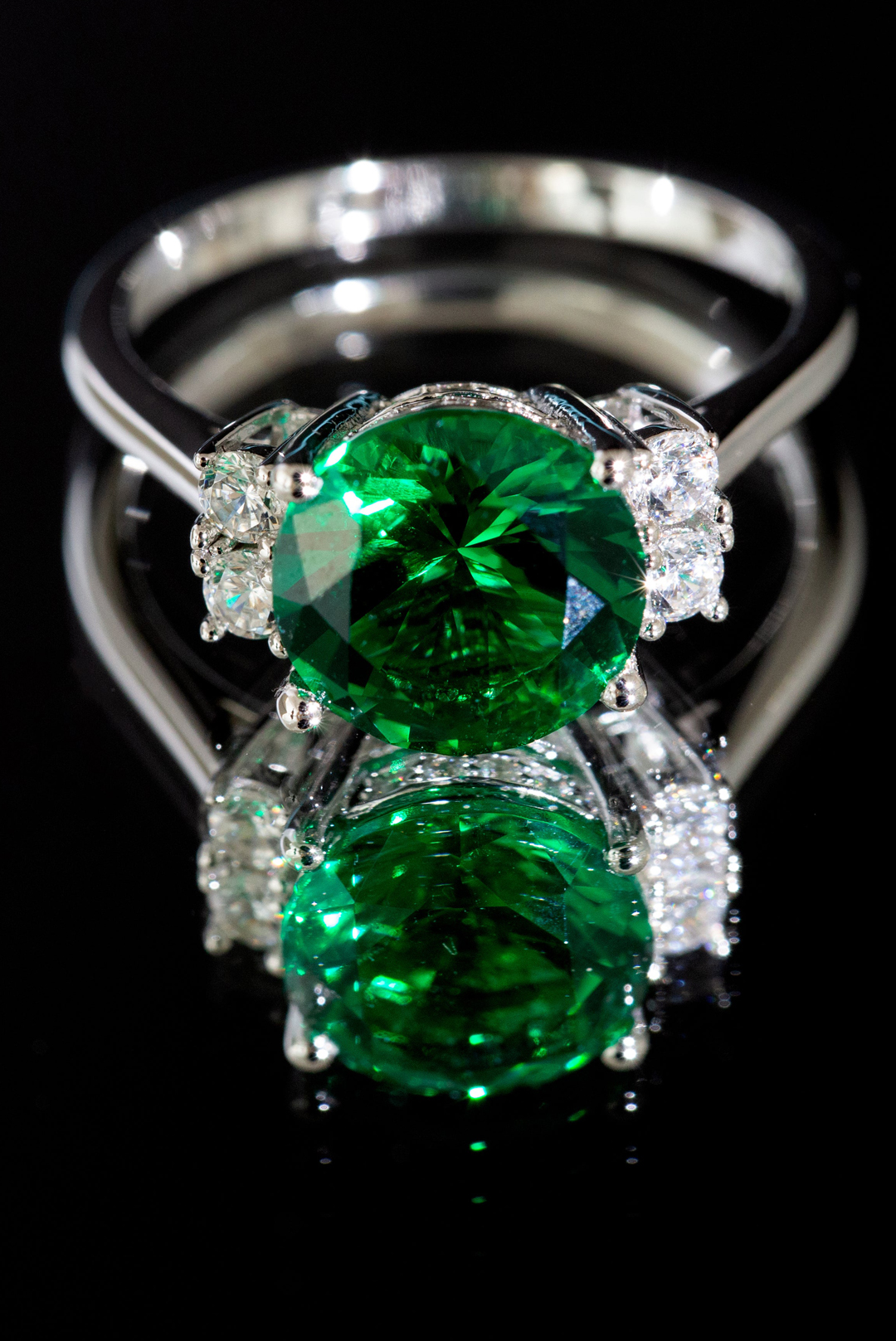 Round μοϊσανίτης σε βαθύ σμαραγδί απόχρωση  διακοσμημένος σε pave σχέδιο με μικρότερους μοϊσανιτες στα πλαϊνά δεμένο σε σκελετό από ασήμι 925. GM: 3,77 Καράτια Βάρος: 2.00