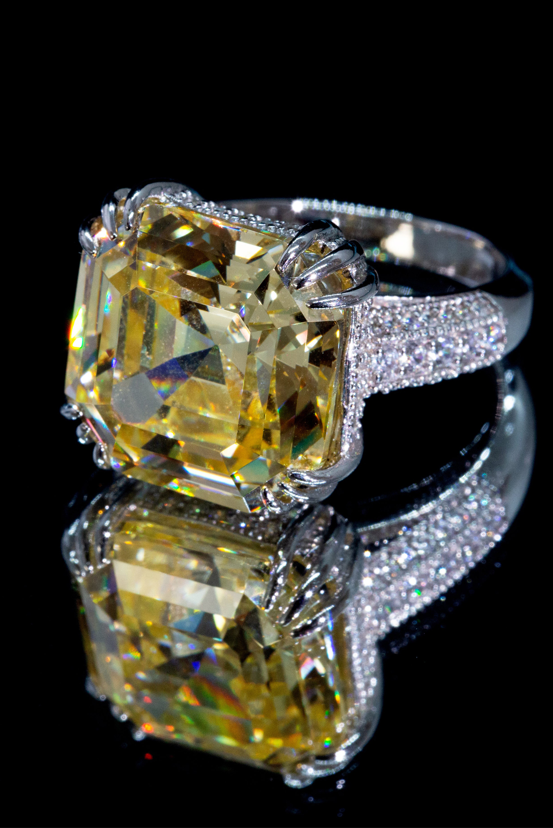 Cushion μοϊσανίτης σε ανοιχτό κίτρινο χρώμα, με pave σχέδιο διακοσμημένο με μικρότερους άχρωμους μοϊσανίτες και σε σκελετό απο ασήμι 925. GM: 7,9 0 καράτια Βάρος: 3.5
