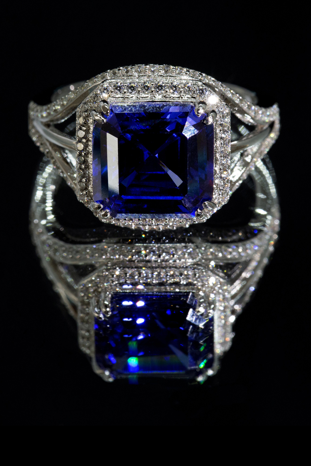 Square μοϊσανίτης σε βαθύ μπλέ  διακοσμημένος σε pave σχέδιο με μικρότερους μοϊσανιτες στα πλαϊνά δεμένο σε σκελετό από ασήμι 925. GM: 5,05 Καράτια Βάρος: 2.50