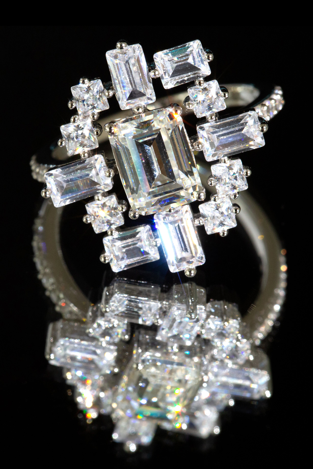 Αχρωμος μοϊσανίτης διακοσμημένος σε pave σχέδιο με μικρότερους μοϊσανιτες στα πλαϊνά δεμένο σε σκελετό από ασήμι 925. GM: 4,75 Καράτια Βάρος: 2.00