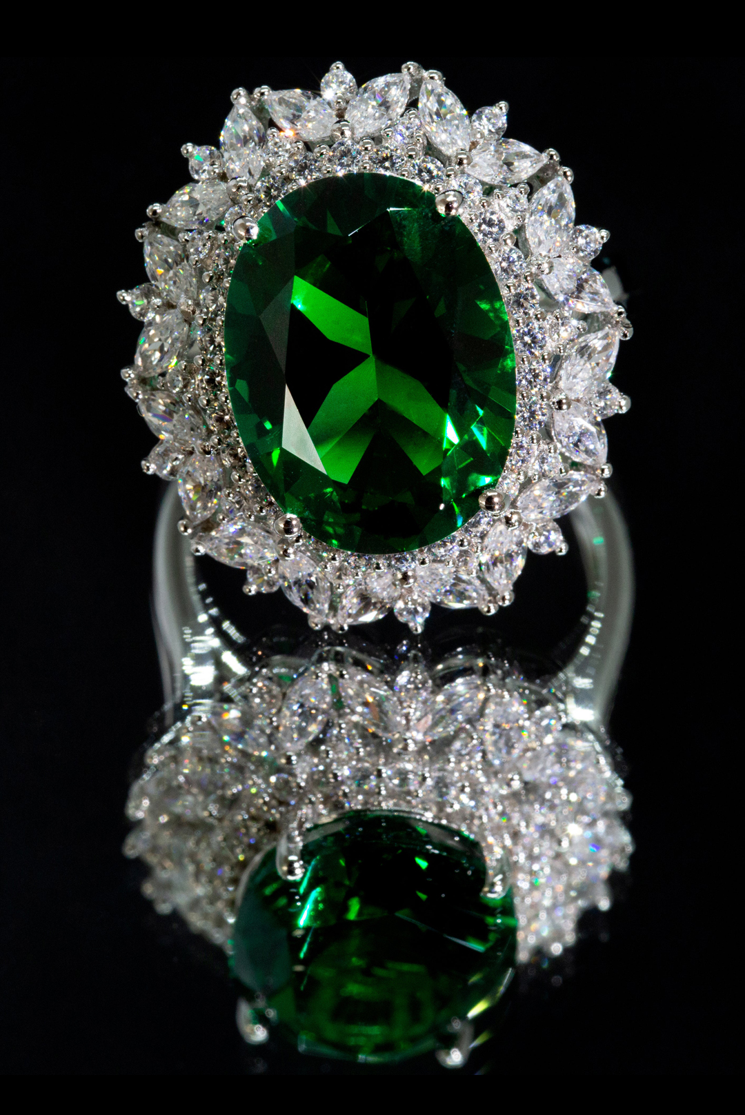 Oval μοϊσανίτης σε βαθύ σμαραγδί απόχρωση  διακοσμημένος σε pave σχέδιο με μικρότερους μοϊσανιτες στα πλαϊνά δεμένο σε σκελετό από ασήμι 925. GM: 7,8 0 Καράτια Βάρος: 4.00