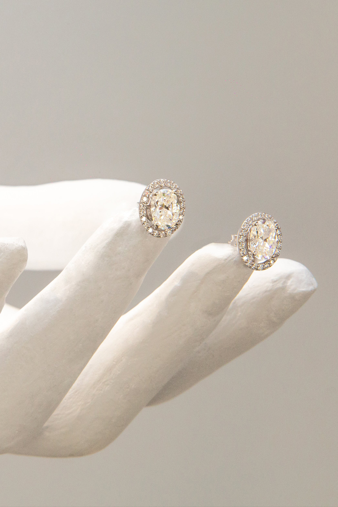 Oval άχρωμα σκουλαρίκια μοϊσανίτη διακοσμημένα σε pave σχεδιο με μικρότερους μοϊσανίτες στα πλαϊνά, σε σκελετό από ασήμι 925. GM: 2,50 Καράτια Βάρος: 2,00