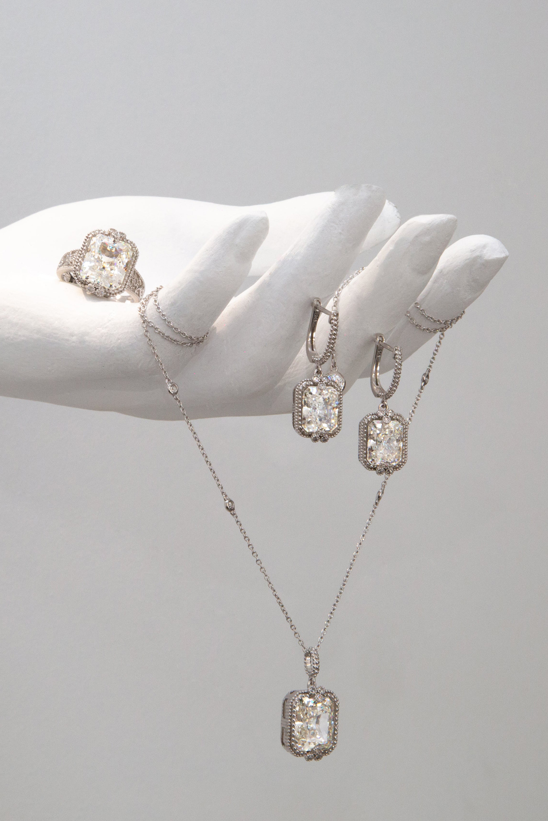 Radiant άχρωμος μοϊσανίτης διακοσμημένος σε pave σχέδιο με μικρότερους μοϊσανιτες στα πλαϊνά δεμένο σε σκελετό από ασήμι 925. GM: 20,5 Καράτια Βάρος: 8.00
