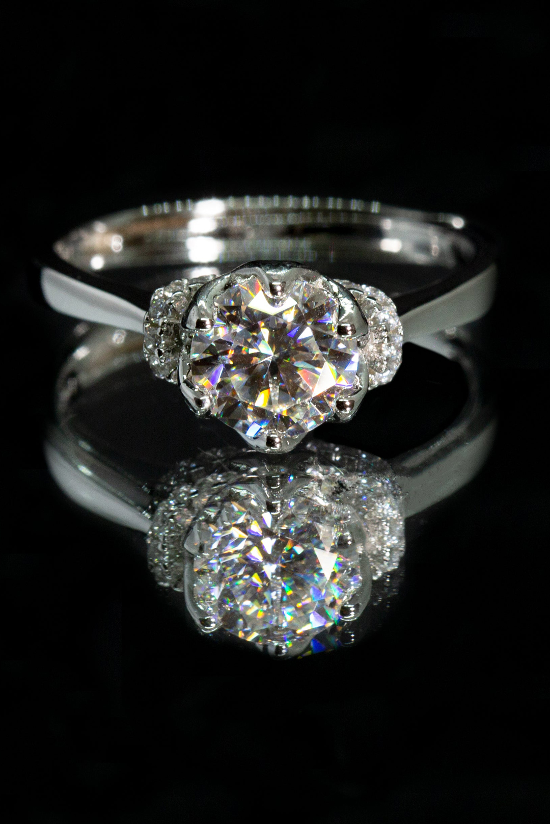 Round brilliant άχρωμος μοϊσανίτης διακοσμημένος σε pave σχέδιο με μικρότερους μοϊσανιτες στα πλαϊνά δεμένο σε σκελετό από ασήμι 925. GM: 2,51 Καράτια Βάρος: 1,00 Πιστοποίηση GRA Μέγεθος:  Ρυθμιζόμενο