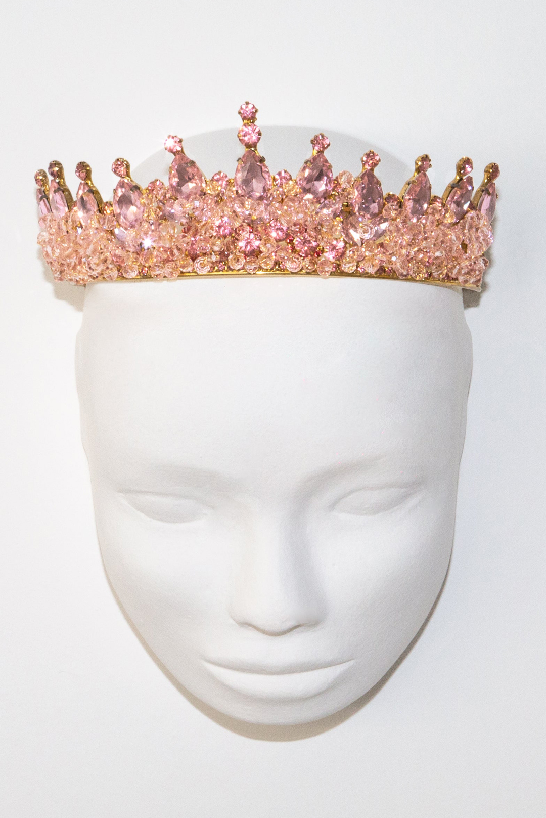 Μεσαίου μεγέθους χειροποίητη τιάρα με παλ ροζ κρύσταλλα, επίχρυση.