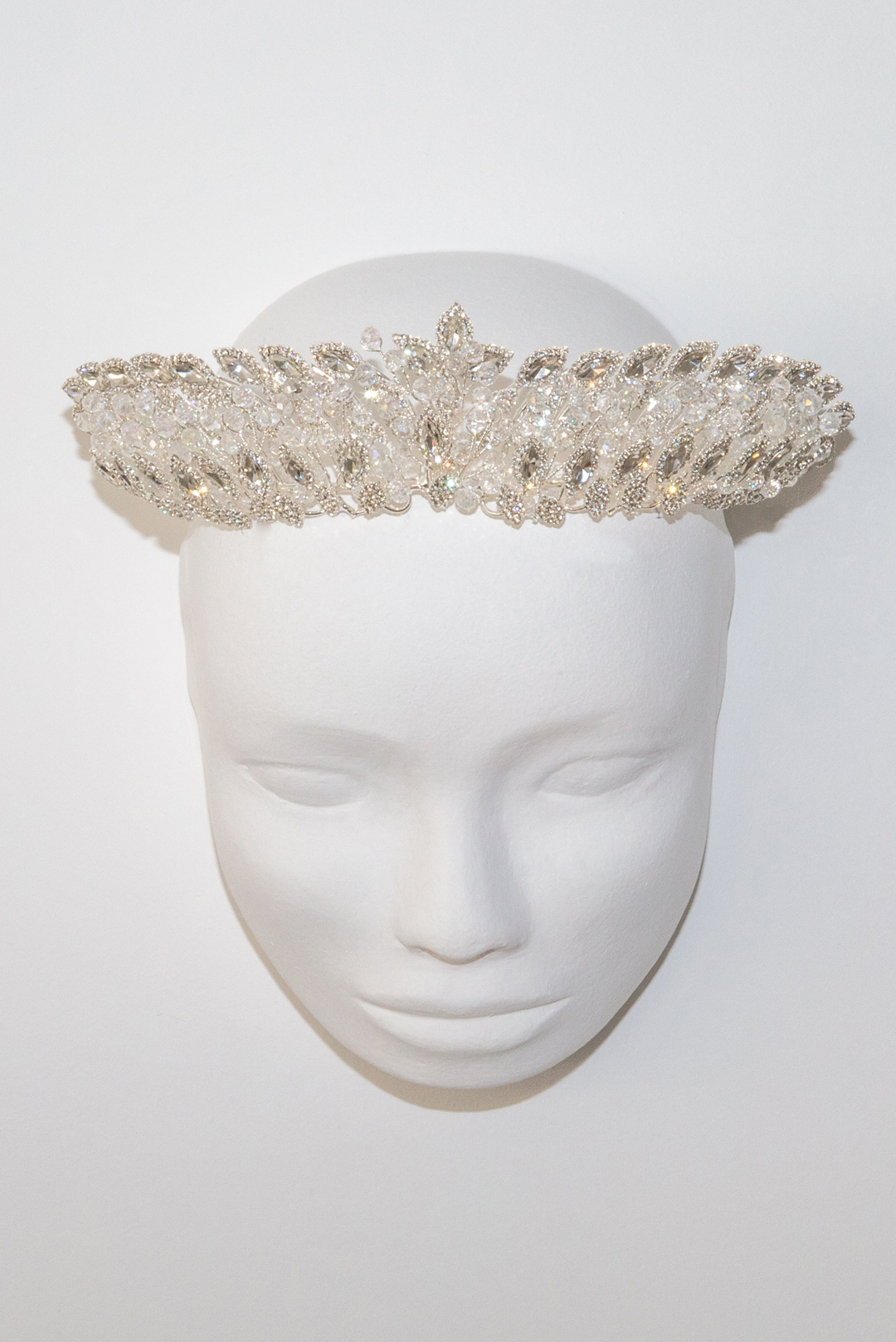 Χειροποίητη τιάρα μεσαίου μεγέθους με διάφανο και αδιάφανο κρύσταλλο σε ασημί σμάλτο.