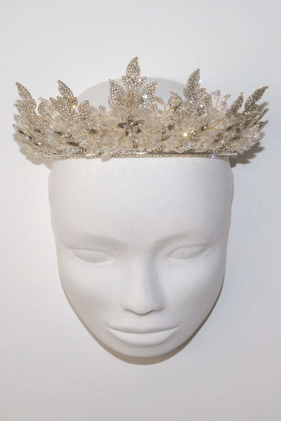 Χειροποίητη τιάρα μεσαίου μεγέθους από διάφανο και αδιάφανο κρύσταλλο, σε ασημί σμάλτο.