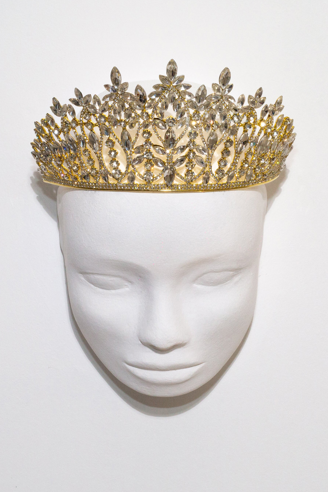 Tall handmade tiara with clear crystals golden plated.