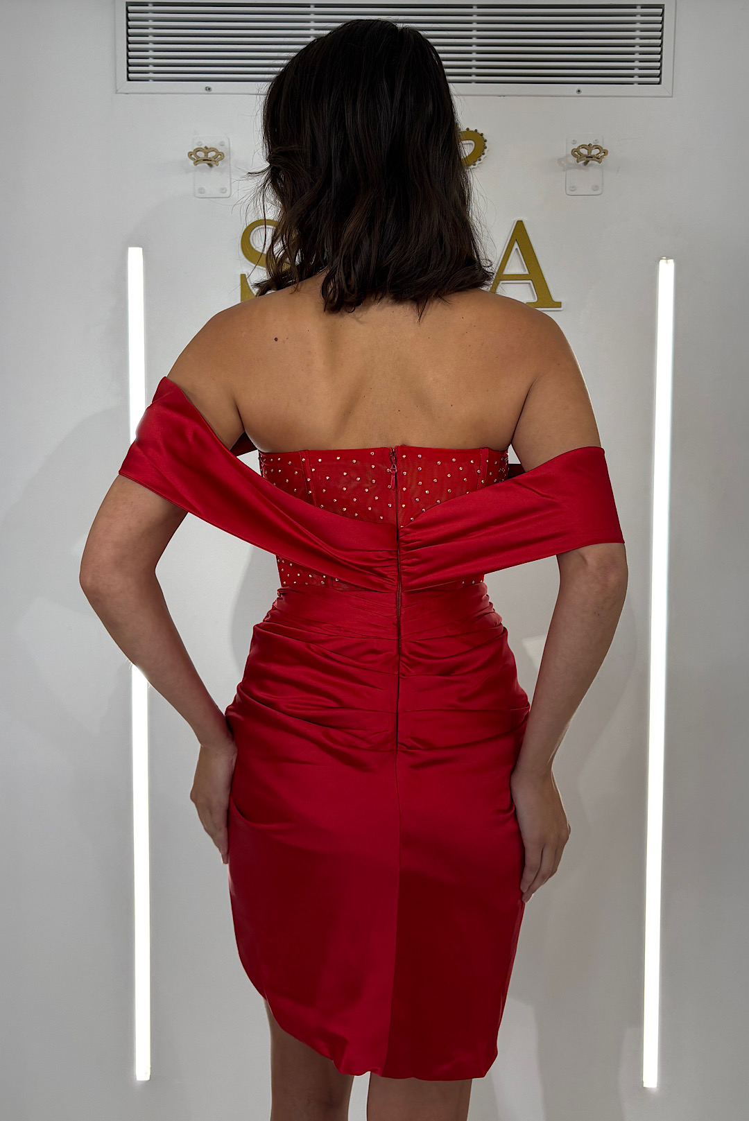 Ένα πολυμορφικό φόρεμα με επιβλητικό τελείωμα στο στήθος και γεμάτο ιριδίζον τρούκς.
