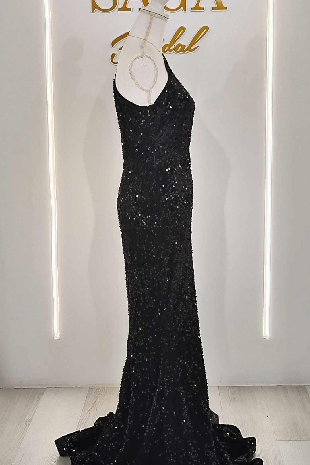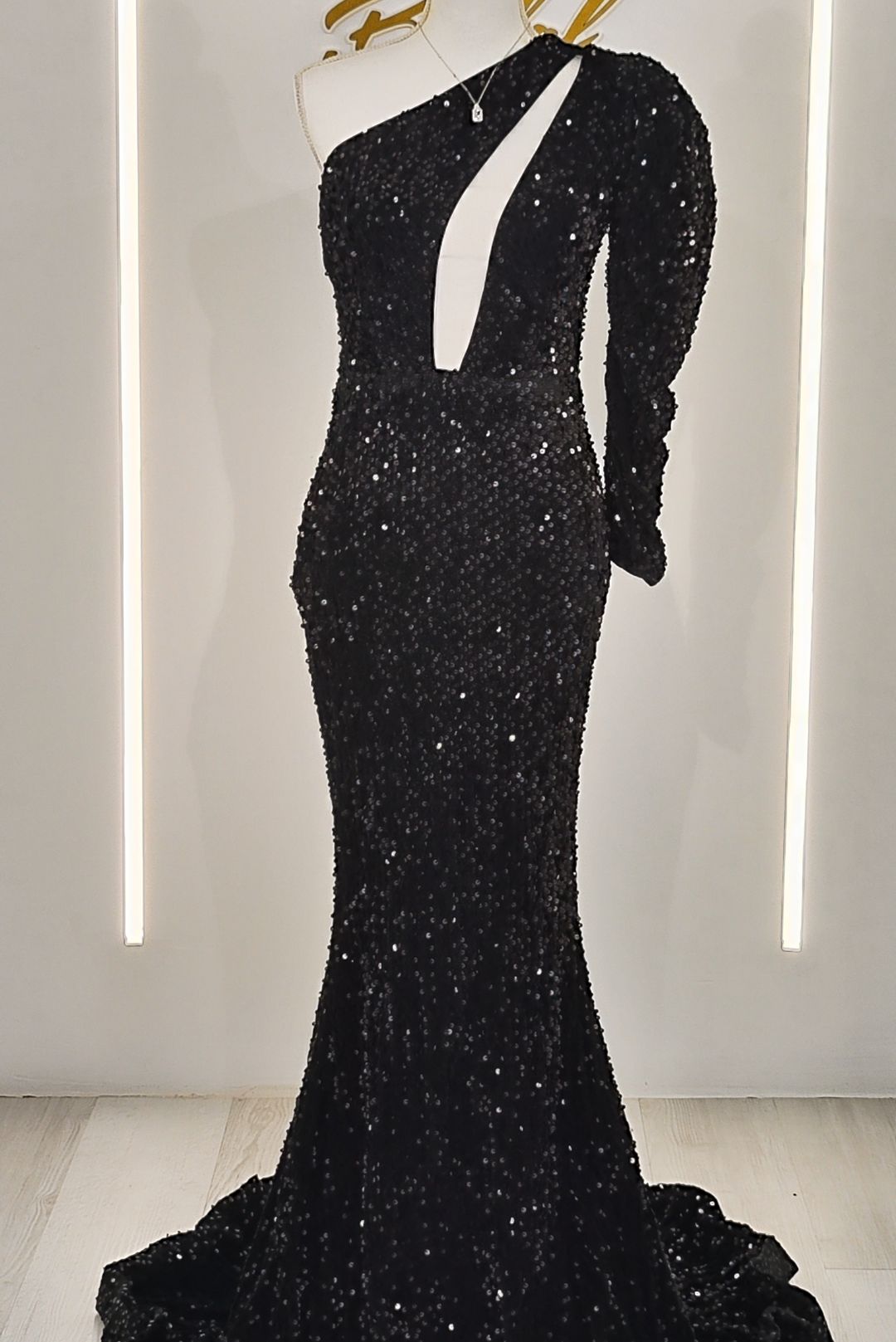 Μαύρο maxi φόρεμα με ανοιχτό ω΄μο και πούλιες