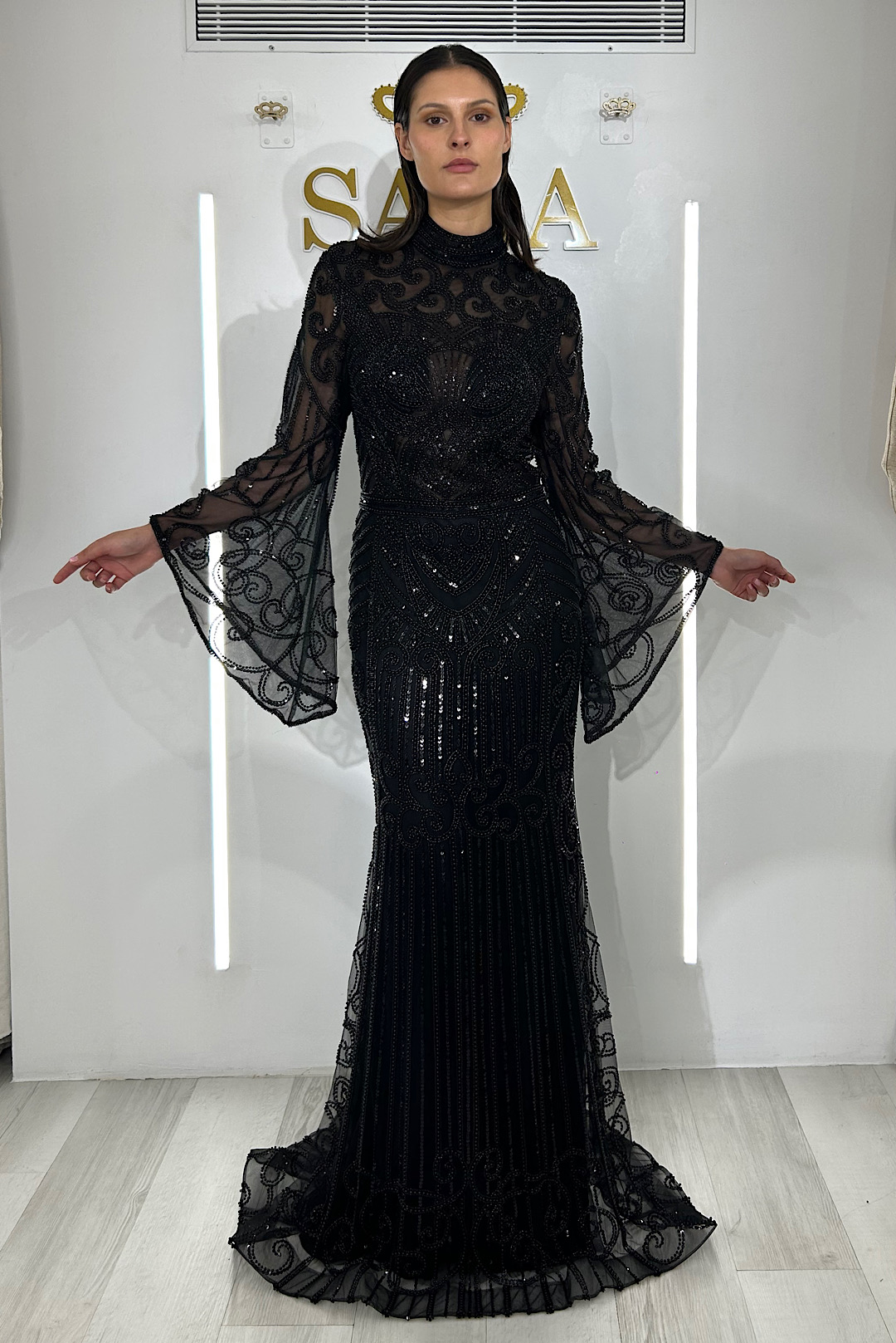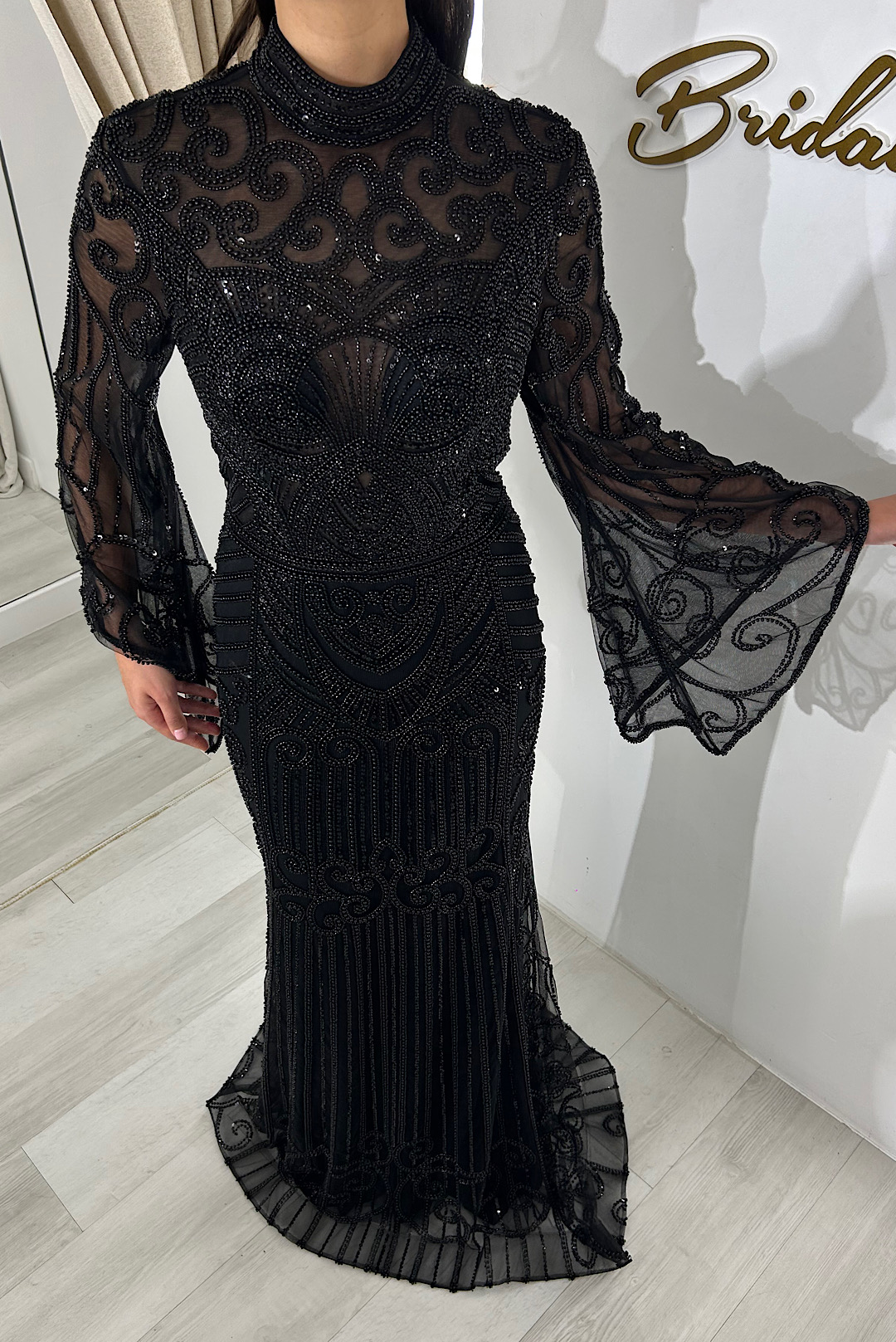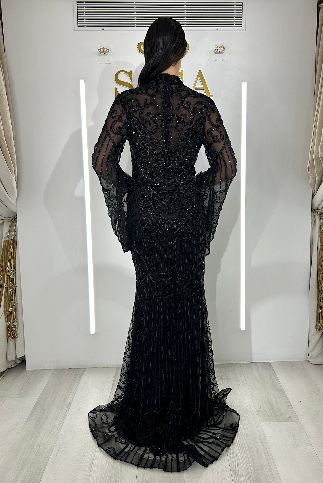 Χειροποίητο μαύρο φόρεμα με μαύρες γυαλιστερές χάντρες σε κέντημα.