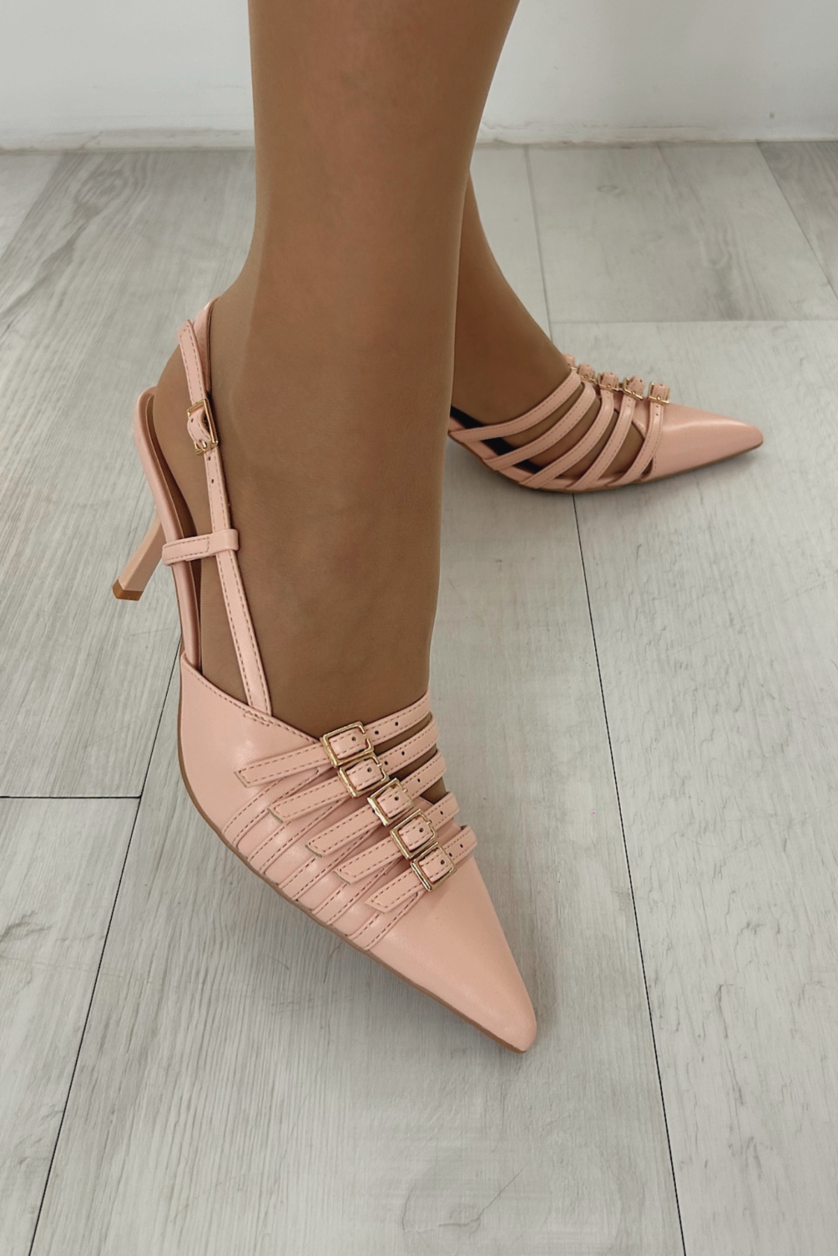 Γόβες σε σαμπανιζέ χρώμα με λουράκια και χρυσές αγκράφες