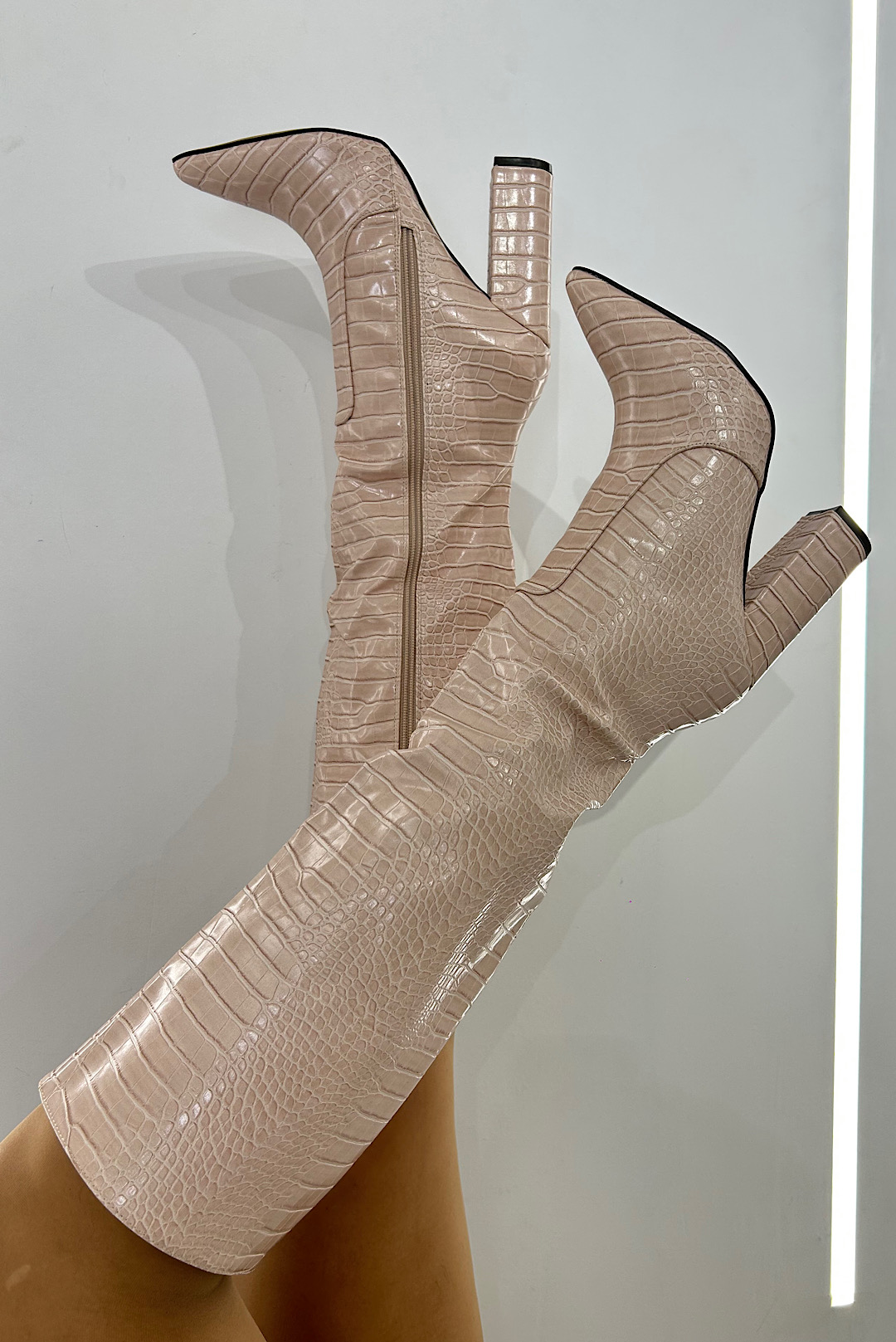 Κροκό δερμάτινες μπότες σε μαύρο , πράσινο , ρόζ και μπέζ χρώμα.