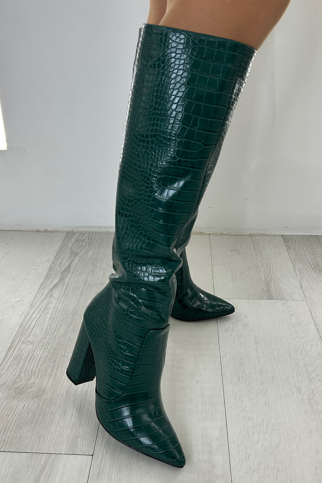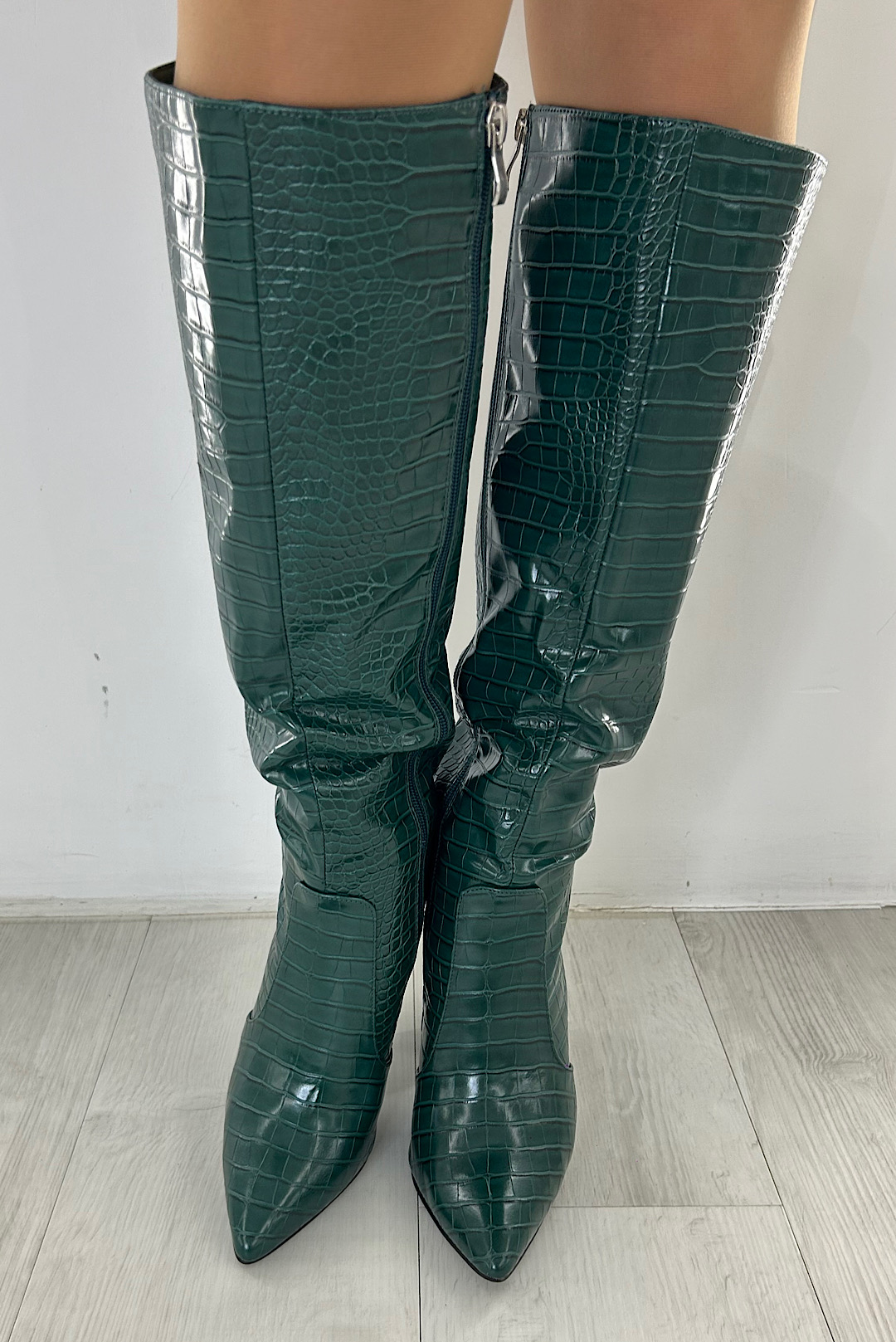 Κροκό δερμάτινες μπότες σε μαύρο , πράσινο , ρόζ και μπέζ χρώμα.