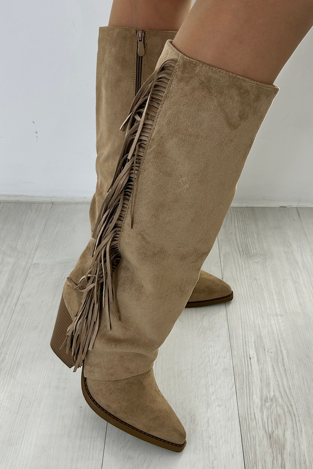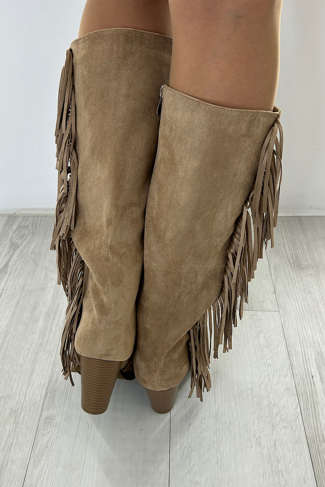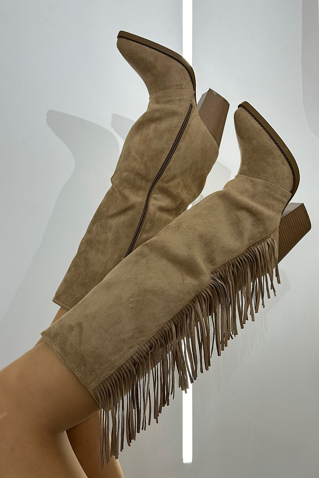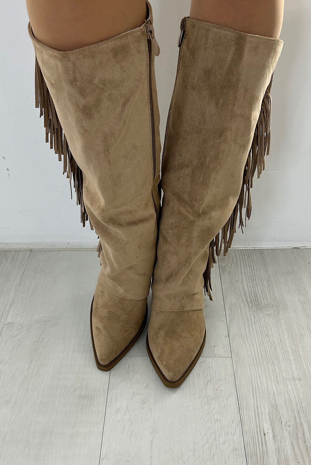 Μπότες σουέτ σε μπέζ και μαύρο χρώμα με κρόσια στην εξωτερική μεριά