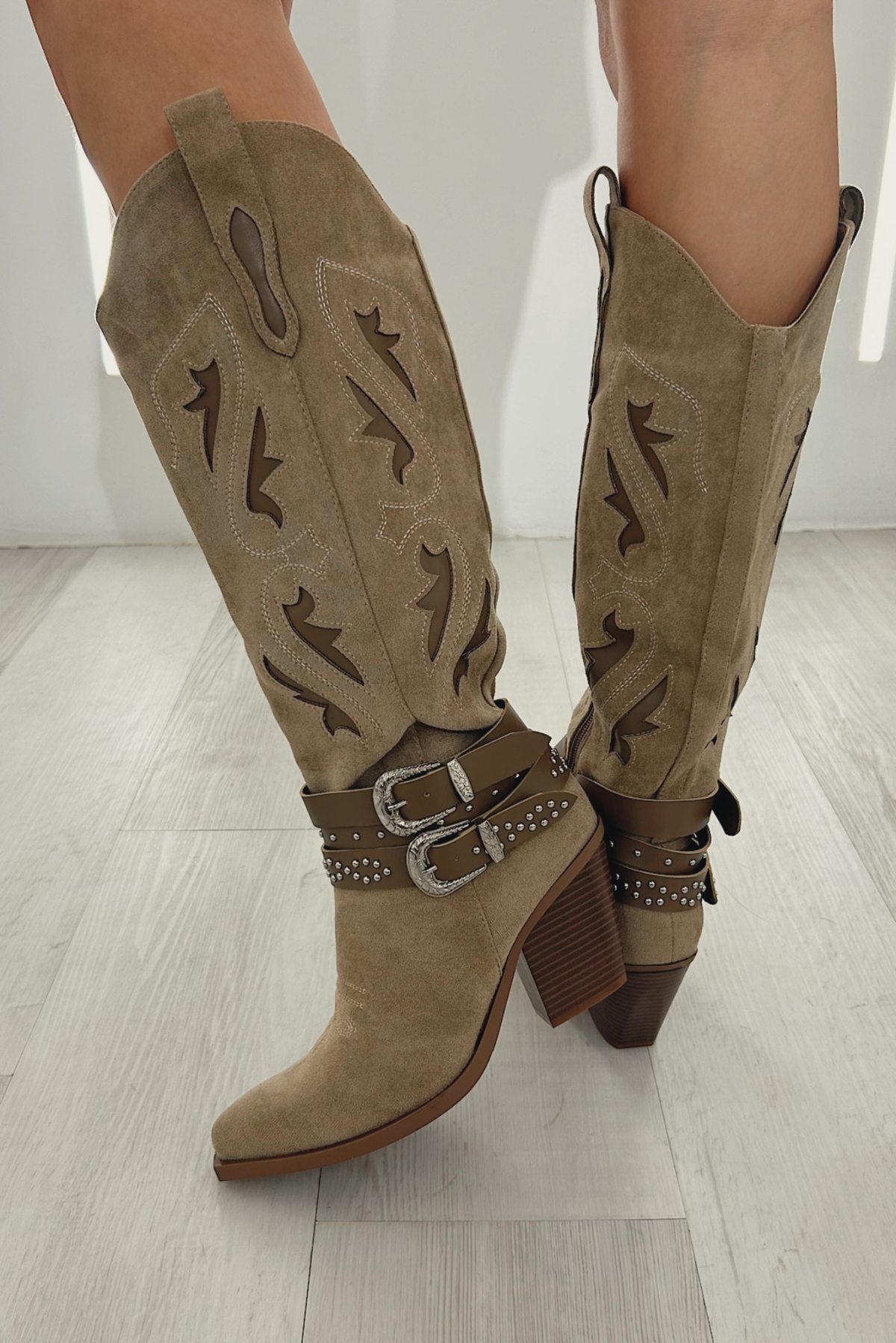 Μπότες καουμπόΪ στυλ σε σουέτ υφή με δερμάτινα λουριά και μεταλλικές λεπτομέριες,