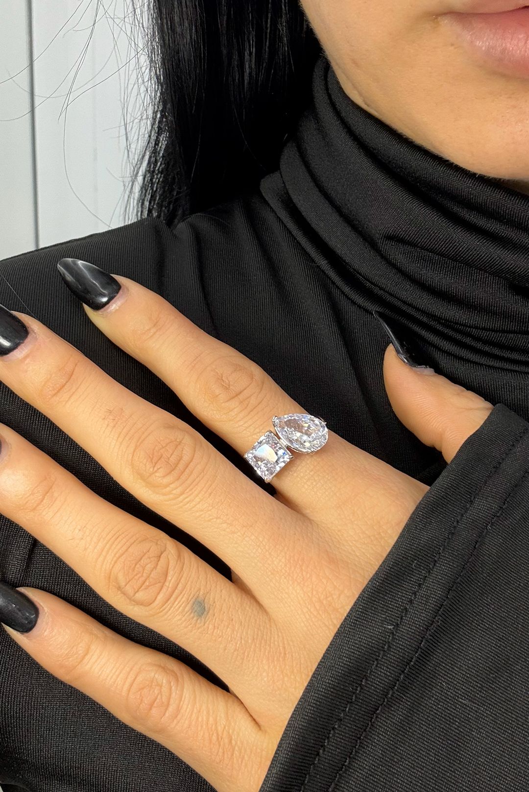 Δαχτύλιδι με VVS1 κυβική ζιρκονία σε σχήμα τετράγωνο και δάκρυ δεμένο σε ασήμι 925.