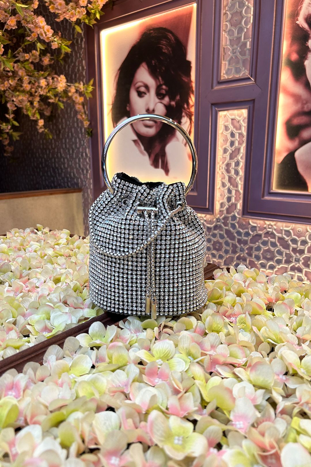 Τσάντα πουγγί σε μαύρο, ασημί, χρύσο και μπλέ χρωματα με ασημί αλύσιδα ώμου.