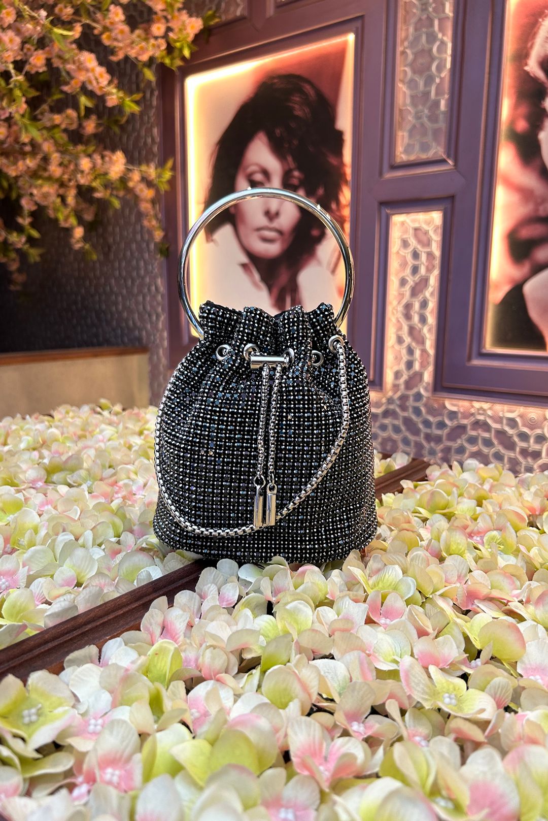 Τσάντα πουγγί σε μαύρο, ασημί, χρύσο και μπλέ χρωματα με ασημί αλύσιδα ώμου.