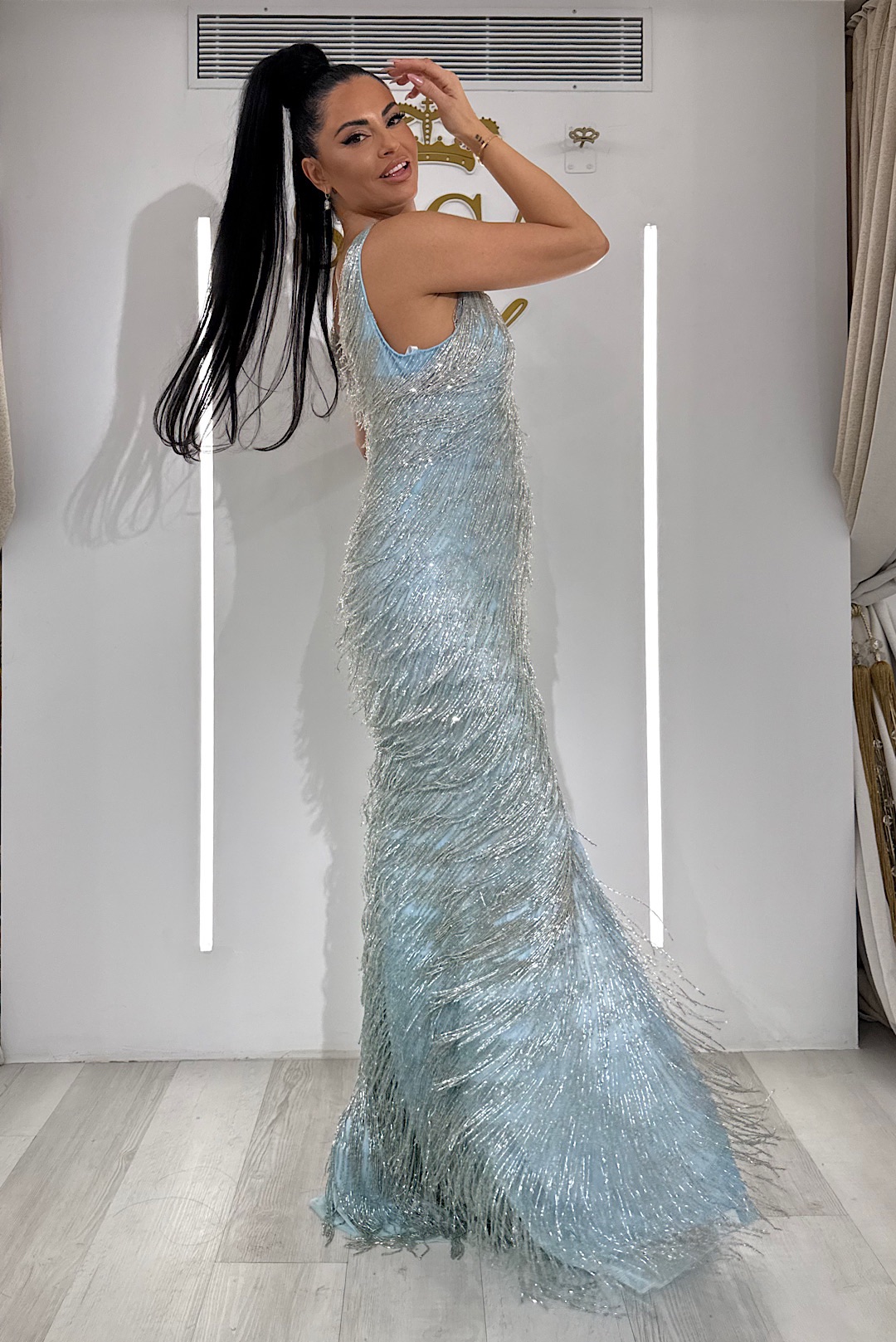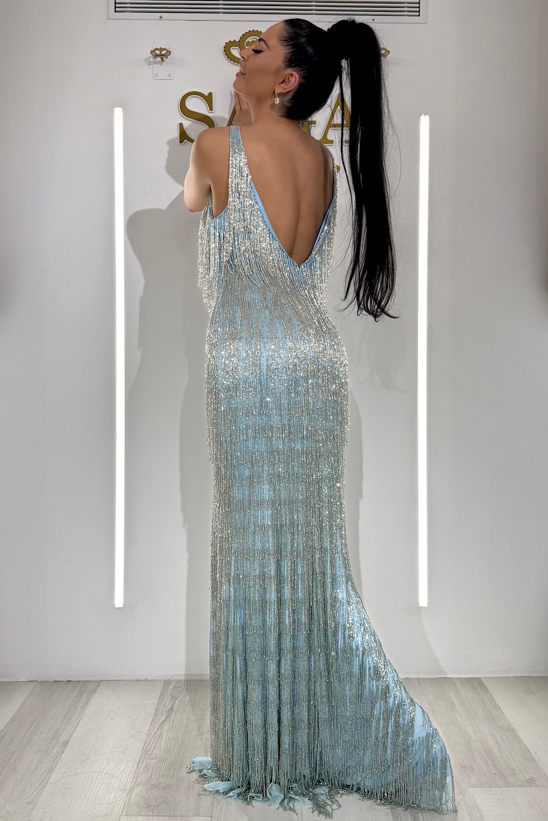 Ένα χειροποίητο maxi φόρεμα σε baby blue φόδρα και lace ,με ασημί εντυπωσιακά κρόσια και έντονο V με ανοιχτή πλάτη.
