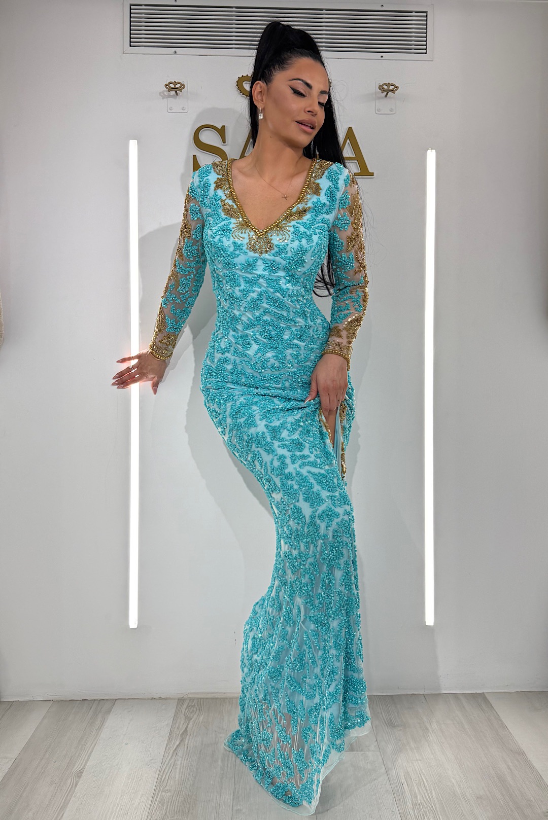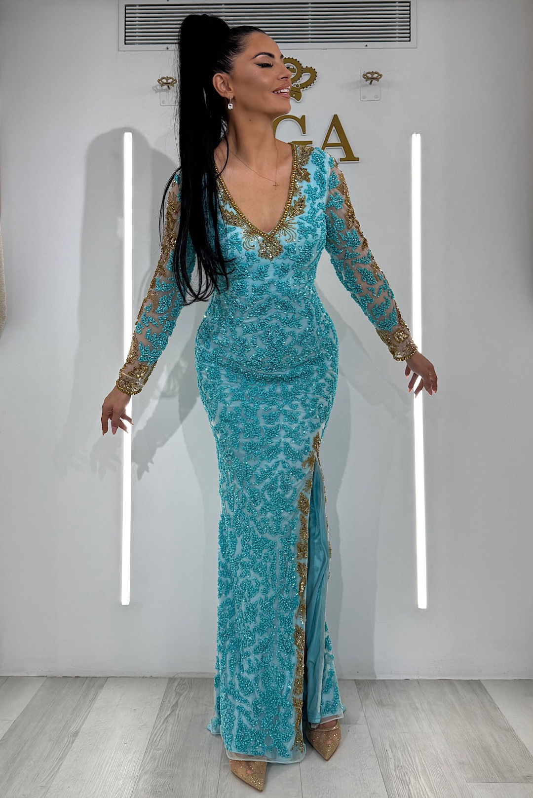 Χειροποίητο maxi φόρεμα με γαλάζια φόδρα και lace το οποίο είναι διακοσμημένο με χρυσές και μπλέ πούλιες & χάντρες.