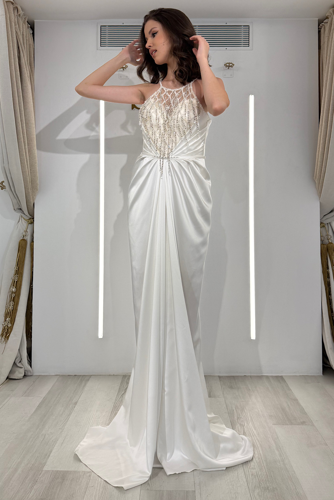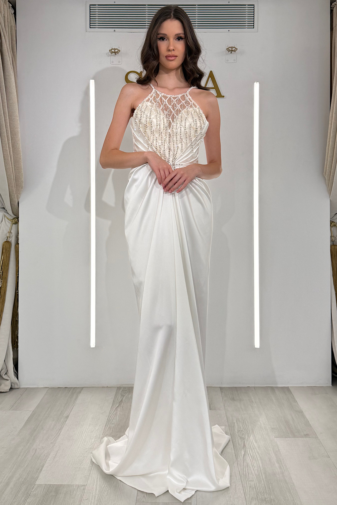 Σατέν φόρεμα σε άσπρο και μπέζ χρώμα, με κρόσια από χάντρες στο μπούστο.