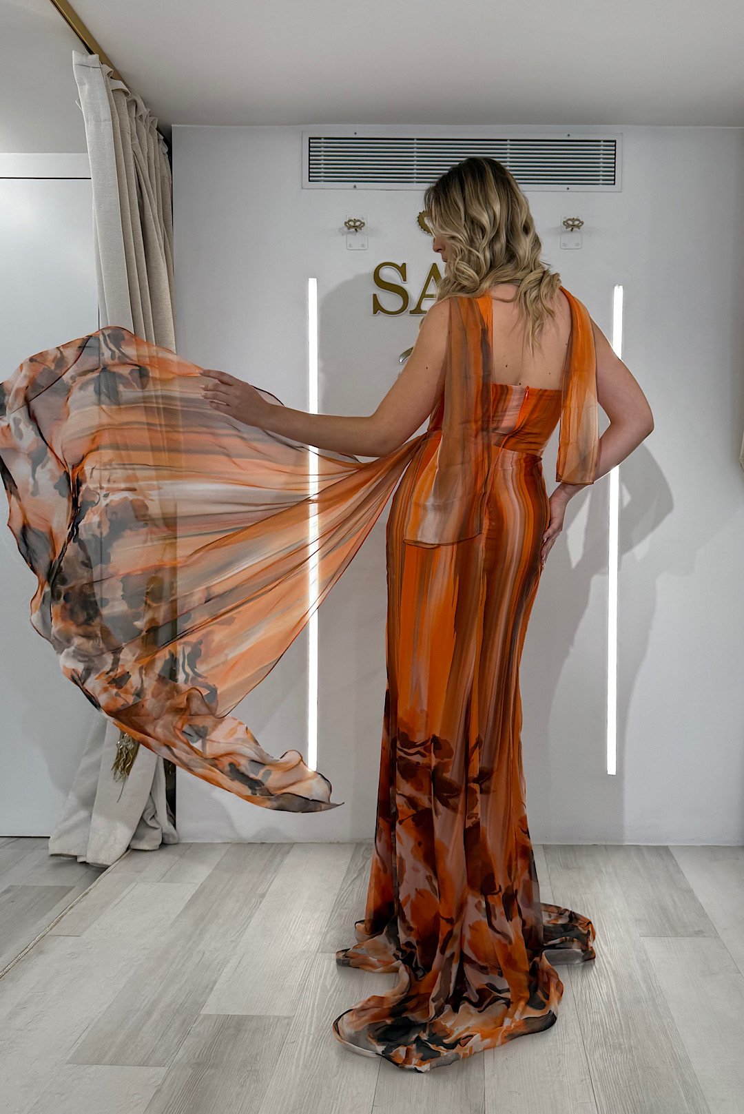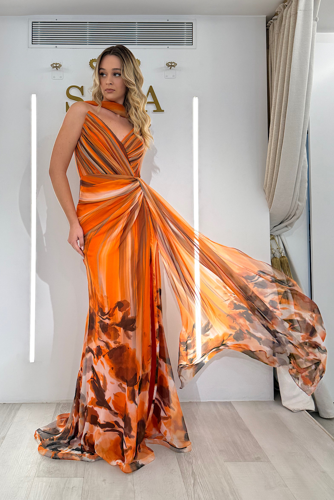 Ένα στράπλες maxi φόρεμα με αέρινο φουλάρι σε πορτοκαλί και καφέ αποχρώσεις.