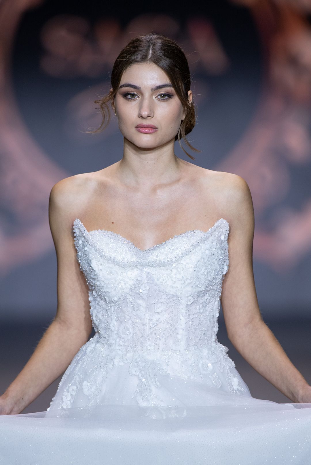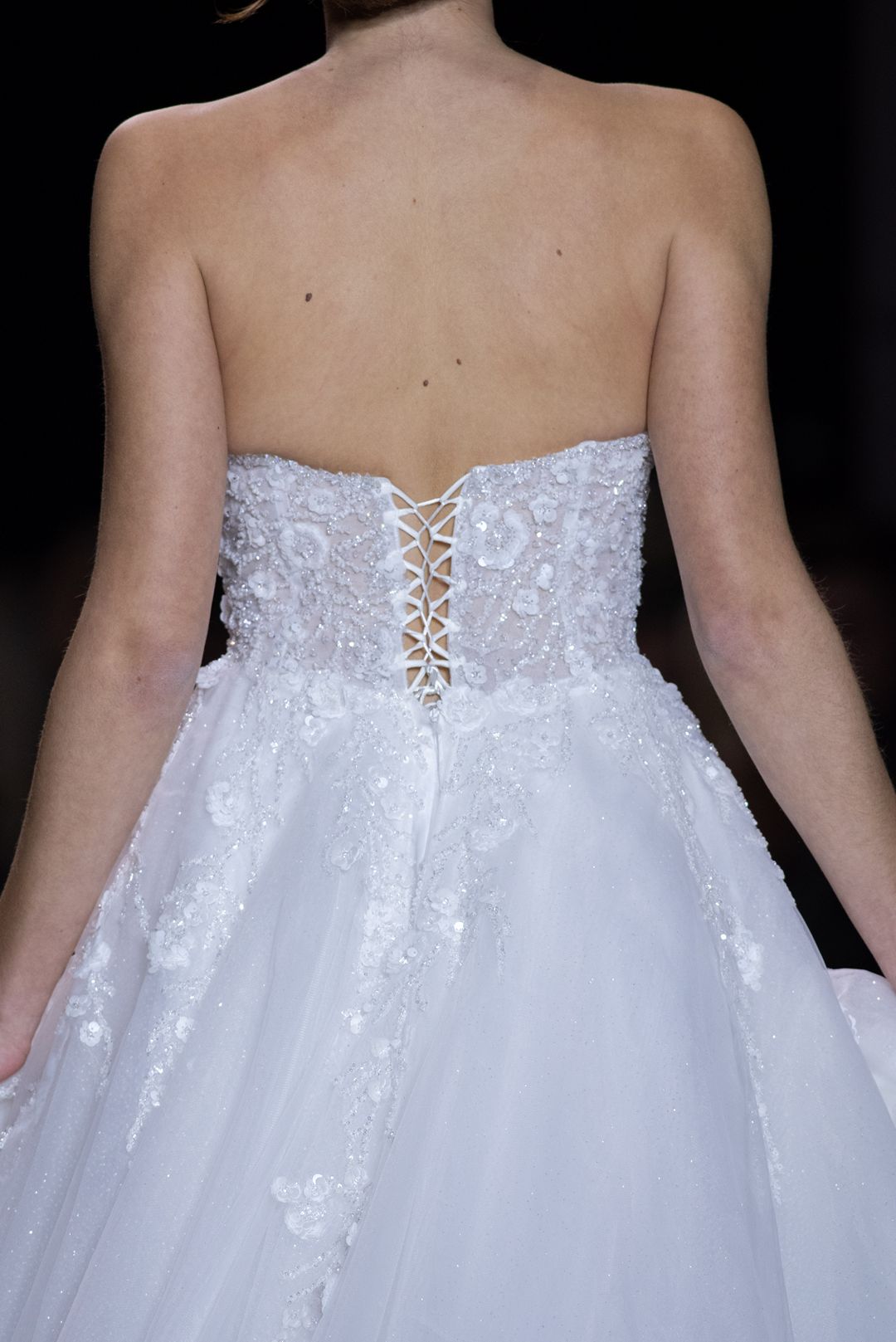 Εντυπωσιακό χειροποίητο λευκό νυφικό σε Bohemian στυλ με κορσέ. Το τολμηρό σχέδιο τονίζει τον γυναικείο σωματότυπο και είναι διακοσμημένο με κρύσταλλα και καταλήγει σε ουρά 1 m.