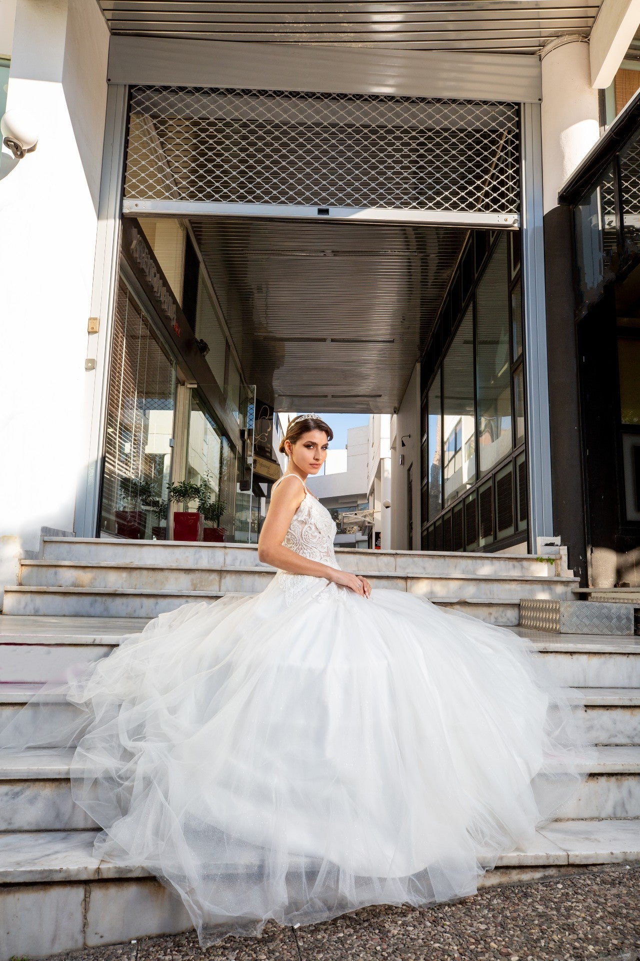 Εντυπωσιακό χειροποίητο λευκό νυφικό σε Bohemian στυλ με κορσέ και αποσπώμενο φούρο. Το τολμηρό σχέδιο V με τις λεπτές τιράντες τονίζει τον γυναικείο σωματότυπο και είναι διακοσμημένο με κρύσταλλα και καταλήγει σε ουρά 1 m.