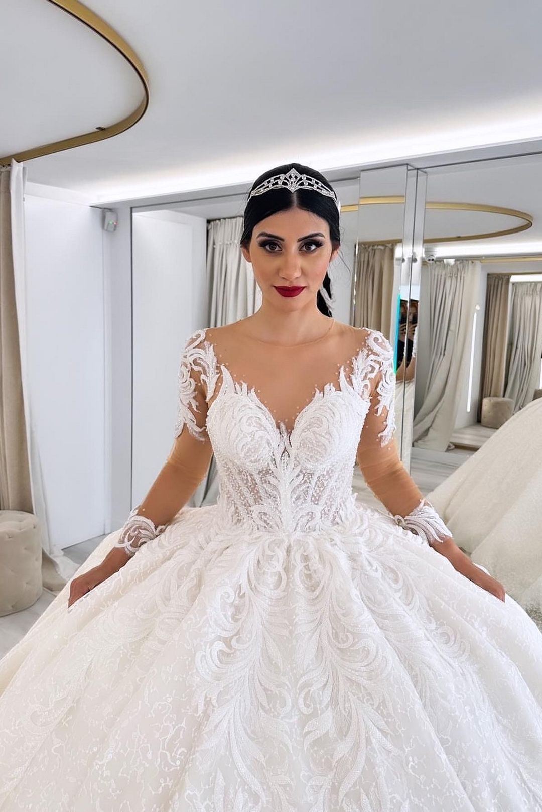 Εντυπωσιακό χειροποίητο λευκό νυφικό σε πριγκιπική γραμμή με κορσέ και αποσπώμενη φουρό. Το τολμηρό σχέδιο V με χοντρές σατέν τιράντες τονίζει τον γυναικείο σωματότυπο. Έιναι διακοσμημένο με κρύσταλλα τύπου swarofski και καταλήγει σε ουρά 2,5 μέτρων.