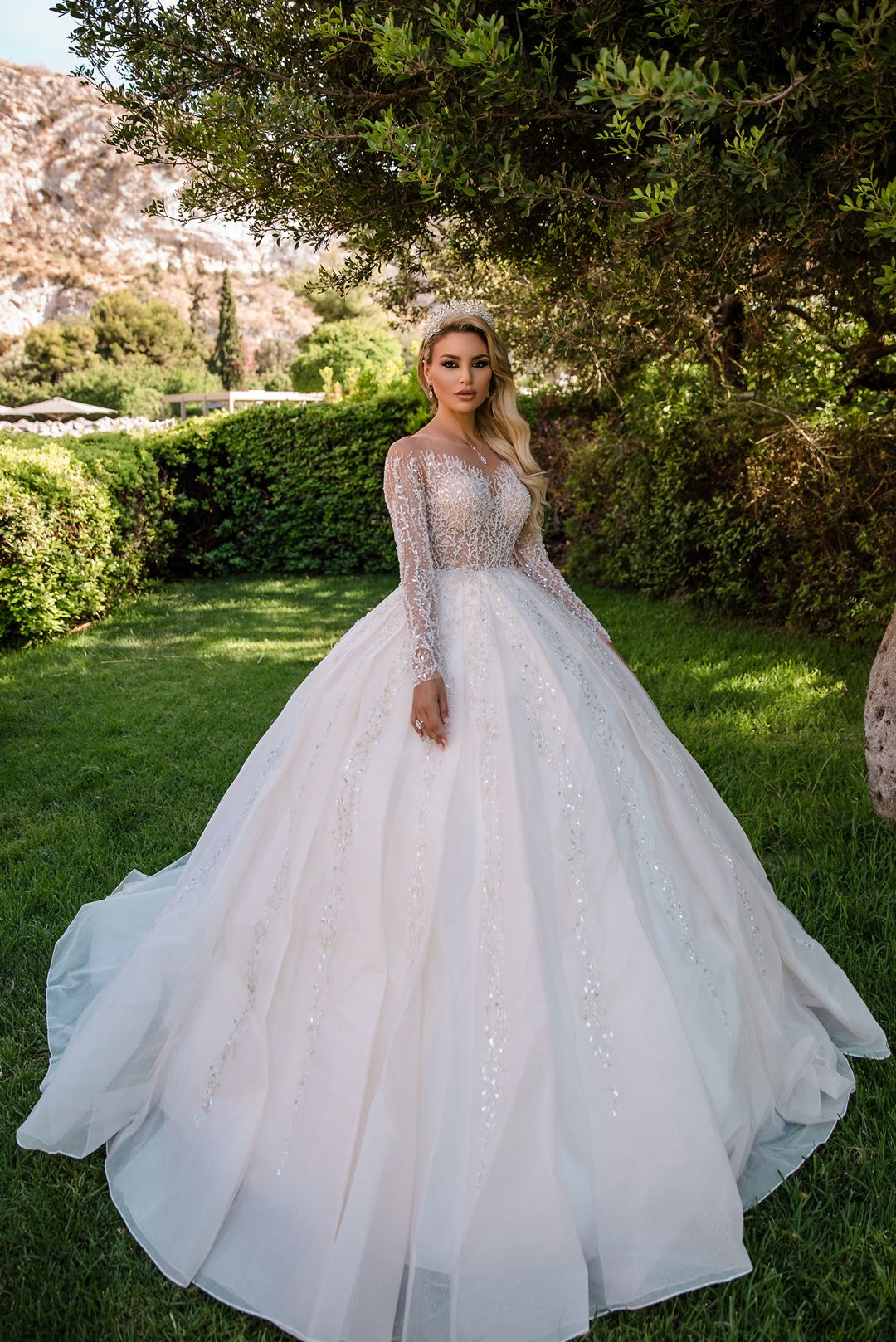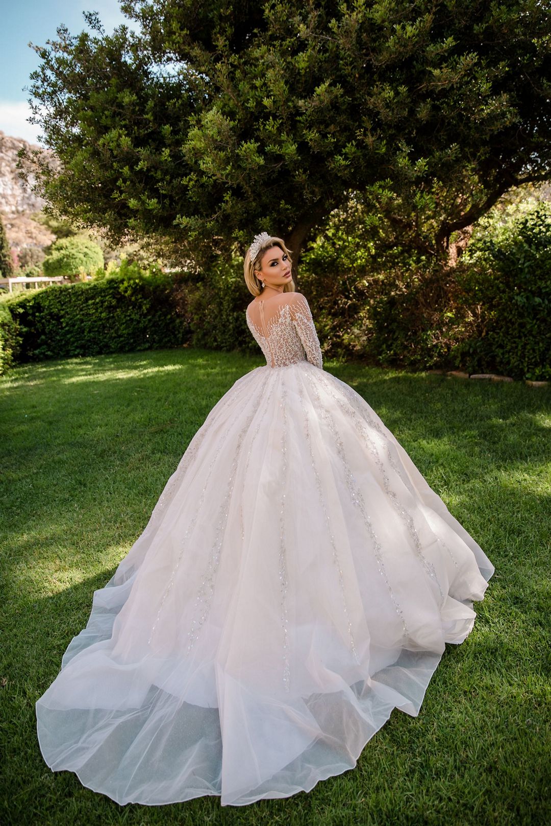 Εντυπωσιακό χειροποίητο εκρού νυφικό σε πριγκιπική γραμμή με φερμουάρ και αποσπώμενο φουρό. Ο σχεδιασμός του αναδεικνύει τον γυναικείο σωματότυπο και είναι διακοσμημένος με μεταξωτό τούλι, χάντρες και κρύσταλλα τύπου swarofski.