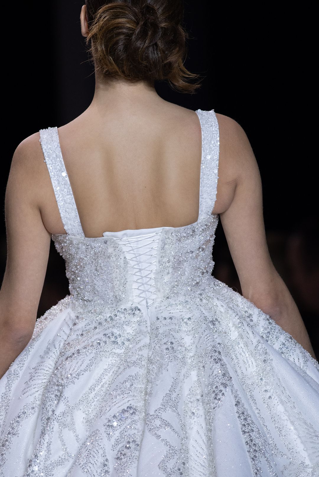 Εντυπωσιακό χειροποίητο λευκό νυφικό σε πριγκιπική γραμμή με κορσέ και φουρό.  Έιναι διακοσμημένο με πούλιες και καταλήγει σε ουρά 2,5 μέτρων.