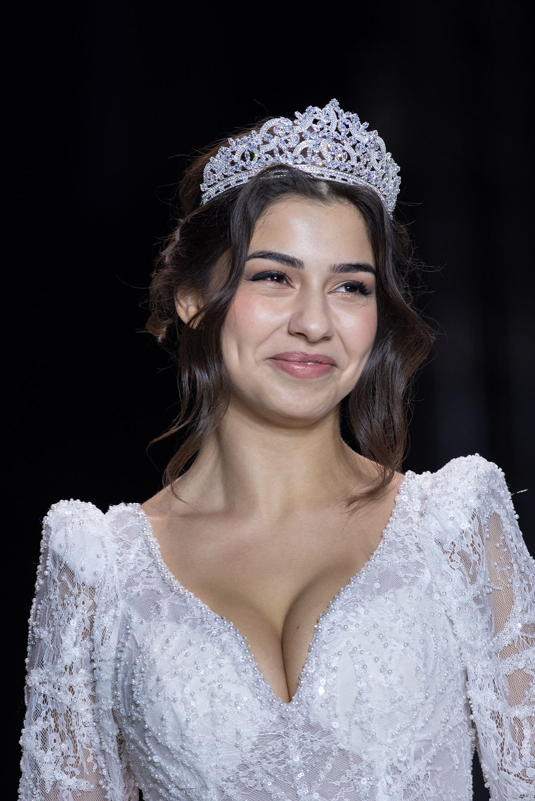 Εντυπωσιακό χειροποίητο λευκό νυφικό σε πριγκιπική γραμμή με κορσέ και φουρό.  Έιναι διακοσμημένο με πέρλες και φούστα σατέν και καταλήγει σε ουρά 2,5 μέτρων.
