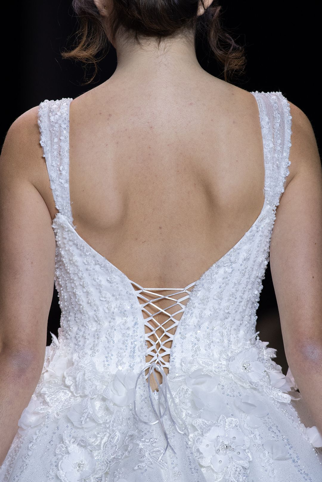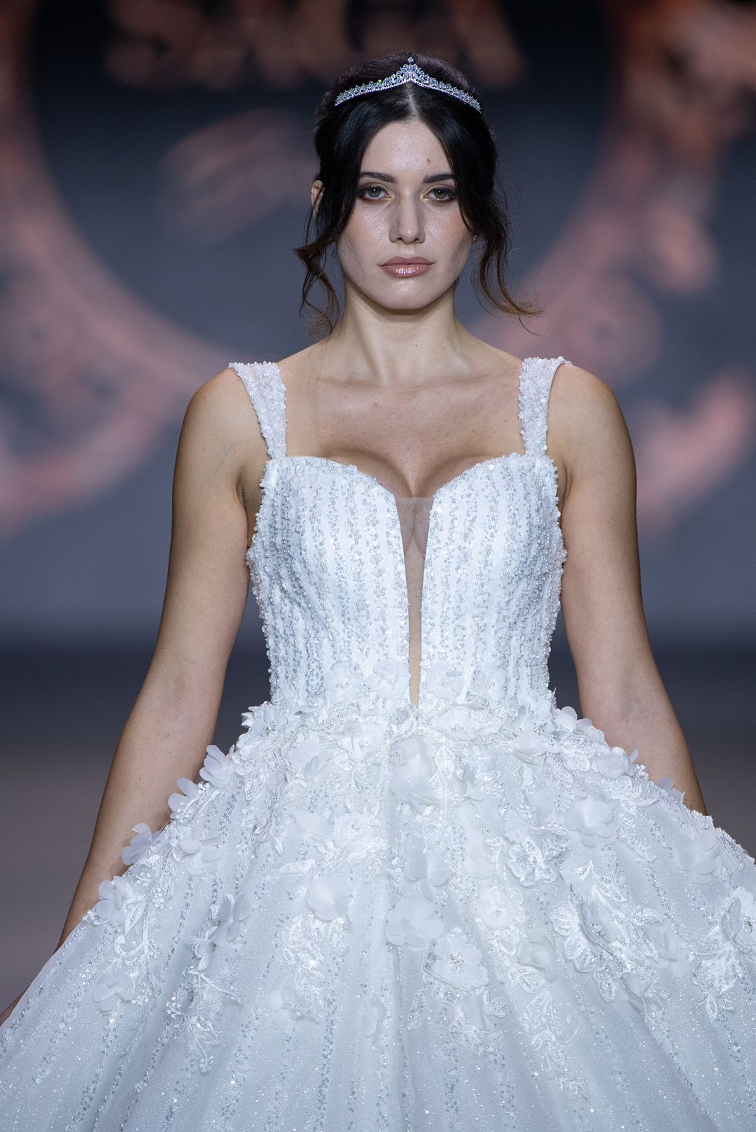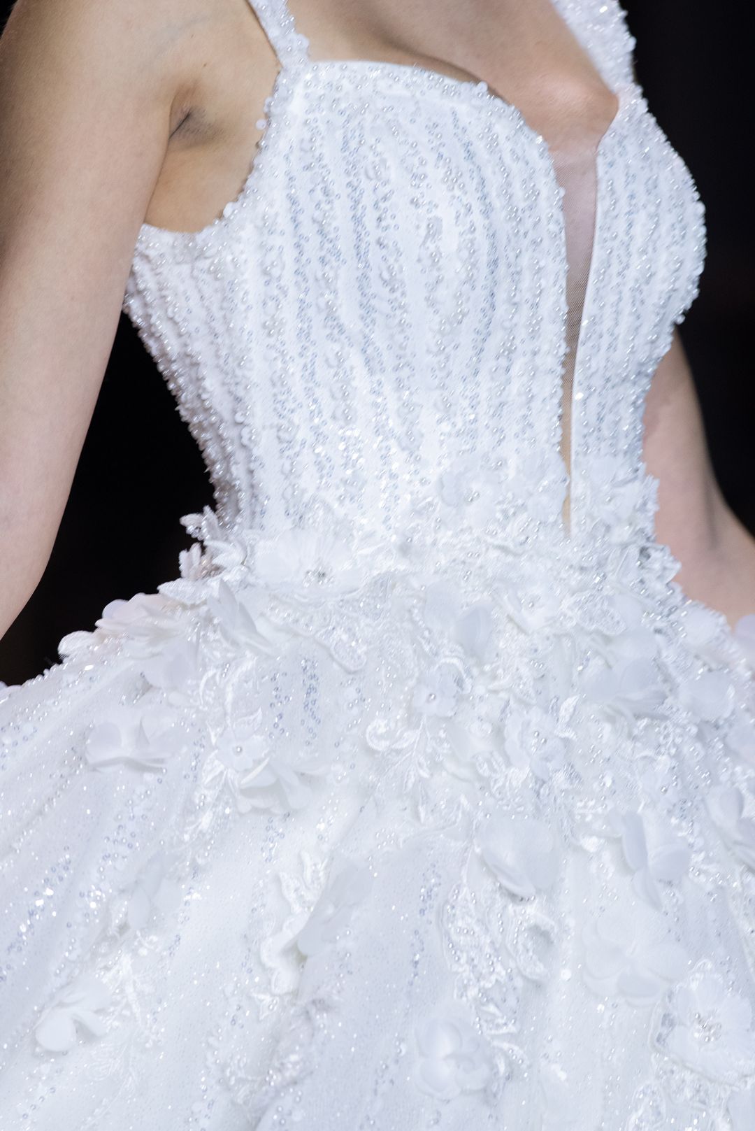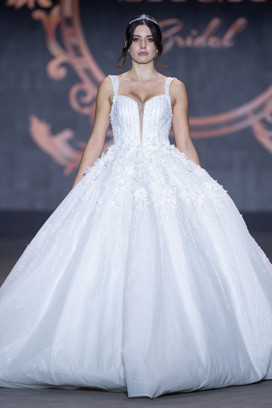 Εντυπωσιακό χειροποίητο λευκό νυφικό σε πριγκιπική γραμμή με κορσέ και φουρό.  Έιναι διακοσμημένο με πέρλες γκλίτερ και καταλήγει σε ουρά 2,5 μέτρων.