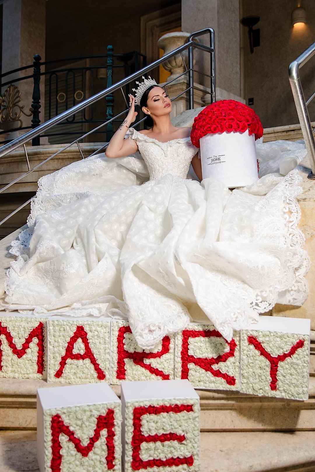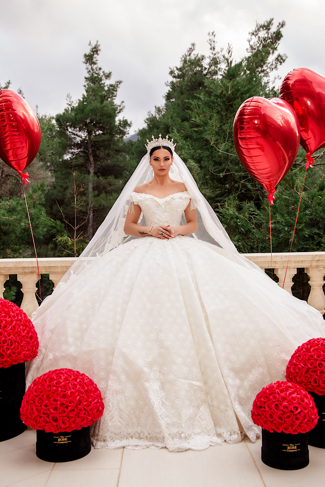 Βασιλικό νυφικό πριγκίπισσας με μπούστο με έξω τους ώμους, απαλά κεντημένο με διακριτική λάμψη. Κατασκευασμένο από δαντέλα και τούλι, διαθέτει ογκώδη φούστα, ουρά σε σχήμα chapel και κορσέ στην πλάτη, δημιουργώντας μια διαχρονική, βασιλική σιλουέτα σε ιβουάρ/ανοιχτό μπεζ.