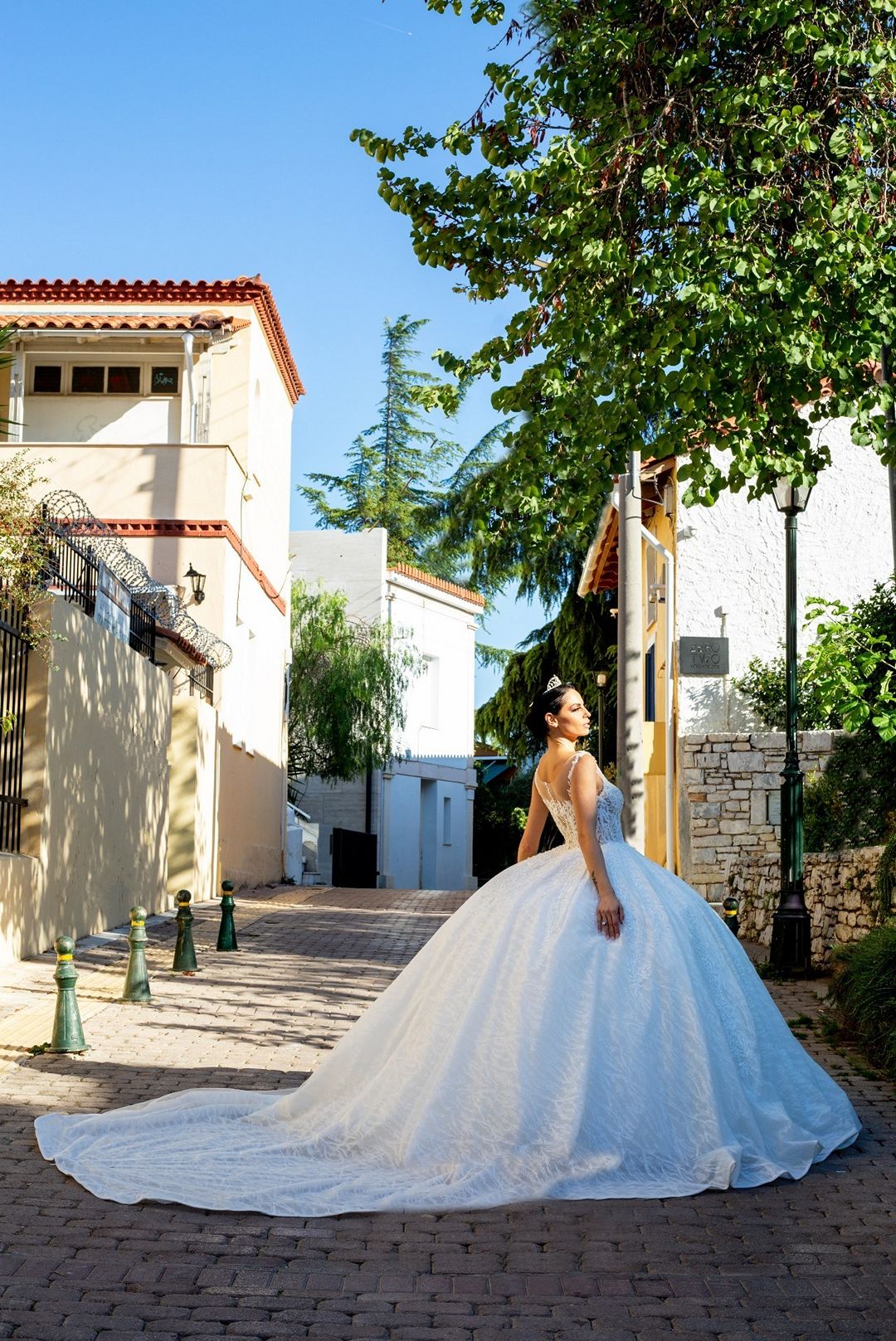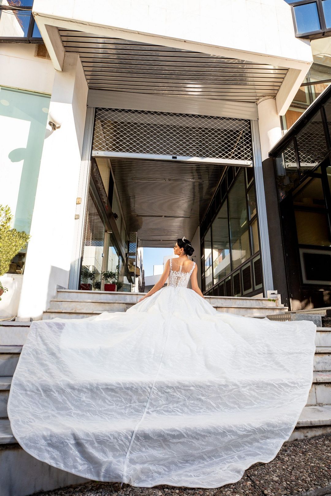 Εντυπωσιακό χειροποίητο νυφικό σε λευκό, πριγκιπική γραμμή με κορσέ και αποσπώμενο φούρο. Η σχεδίασή του κολακεύει τον γυναικείο σωματότυπο και ειναι διακοσμημένο με κέντημα, μεταξωτό τούλι, κρύσταλλα τύπου Swarofski και καταλήγει σε ουρά 2 μέτρων.
